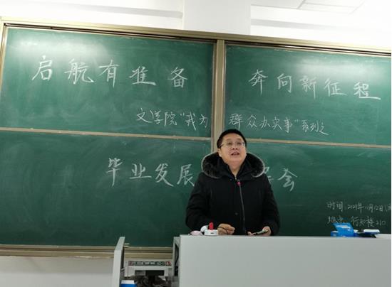 2021年11月13日,beat365在盛乐校区行知楼210召开了主题为“启航有准备,奔向新征程”的毕业生发展指导会。本次会议由汉文系、汉语系、教务办共同举办,教工一支部书记刘伟博士、汉语言文学系副主任胡素莲博士、教务办公室吴永盛老师出席了会议,汉文系、汉语系、秘书系全体毕业生共300余人参加了会议。
