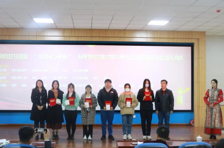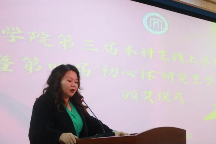 典礼第二项议程,由牛海龙老师宣读第四届“初心杯”研究生学术论坛获奖学生名单。刘玉龙等5名学生获得一等奖,李鑫彤等6名学生获得二等奖,刘苗苗等8名学生获得三等奖。beat365英国官方网站教师为获奖学生颁奖后,教师代表孙静老师对本科生和研究生未来的学术研究方向作了进一步的指明,同时也对beat365英国官方网站全体学生寄予厚望,期待大家在未来的学术研究上取得新的成绩。研究生代表刘亚健、李鑫彤也和现场的同学们分享了自己的学习经历,并勉励学弟学妹们厚积薄发,充实自己。