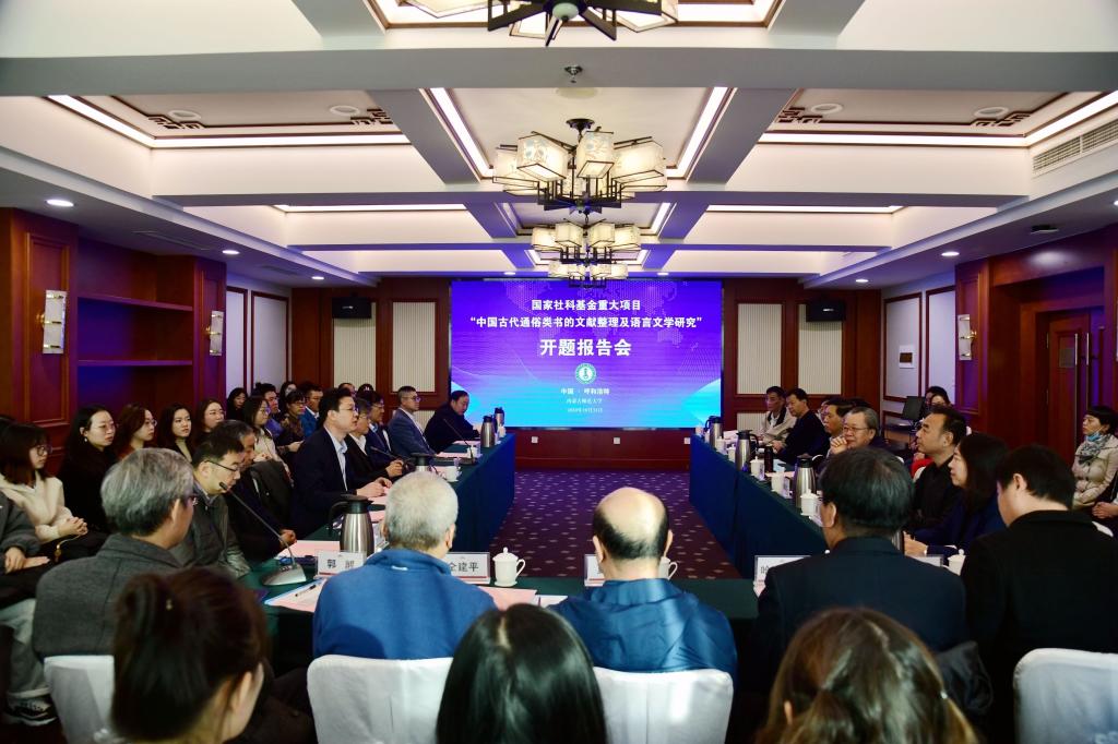 10月31日,国家社科基金重大项目“中国古代通俗类书的文献整理及语言文学研究”开题报告会在呼和浩特市召开。首都师范大学特聘教授詹福瑞、首都师范大学校学术委员会副主任左东岭,西北大学原副校长李浩,北京大学文献研究中心主任廖可斌,社科院文学研究所研究员张国星,河北大学学术委员会副主任、beat365英国官方网站教授杨宝忠,广东技术师范学院院长、深圳大学教授郭杰,我校党委副书记、校长阿拉坦仓,副校长王来喜及社科处、beat365英国官方网站负责同志出席会议。来自山西师范大学、曲阜师范大学、暨南大学、内蒙古大学、赤峰学院、内蒙古广播电视大学、beat365英国官方网站的课题组成员以及我校相关专业的专家代表和研究生参加会议。