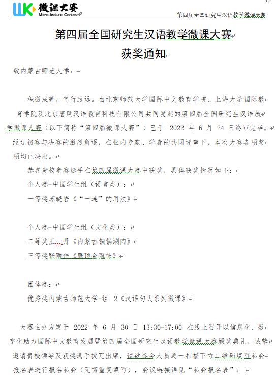 全国研究生汉语教学微课大赛是国内影响范围较广、体现研究生培养水平的国际中文教育专业类赛事,旨在培养“互联网+”背景下有现代教学意识和能力的国际中文教学人才。本次大赛由北京师范大学国际中文教育学院、上海大学国际教育学院以及北京唐风汉语科技有限公司共同发起,大赛共有126所知名高校参加,3800多名学生参赛,提交1700余件参赛作品,经过初赛与决赛的激烈角逐,在业内专家、学者的共同评审下,于2022年6月29日公布第四届全国研究生汉语教学微课大赛获奖名单。我校学生在此次大赛中表现优异,获得个人赛一等奖、二等奖、三等奖各一项,团体赛优秀奖一项,这充分展现了我校汉语国际教育研究生的专业风采,体现了我校汉语国际教育专业研究生的培养成效。