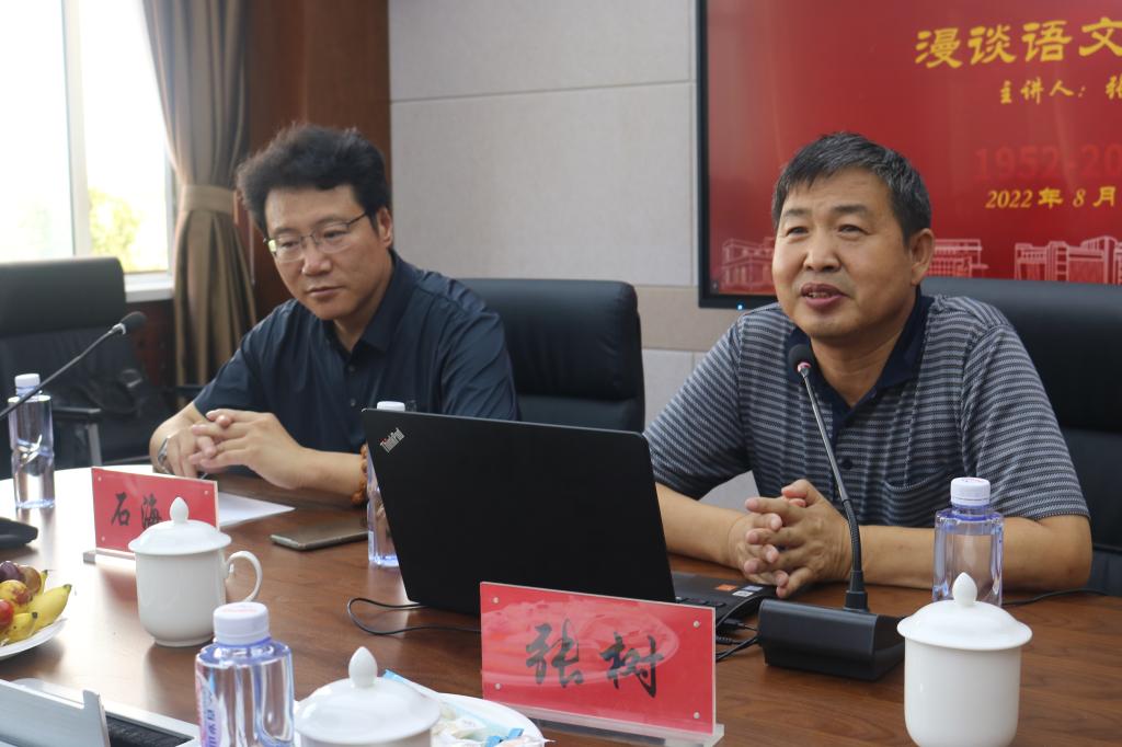 2022年8月7日下午,beat365英国官方网站70周年院庆系列活动之一——“学术讲座”在盛乐校区学院楼A区beat365英国官方网站会议室举行。beat365英国官方网站1990届校友、全国优秀教师、乌海市第一中学校长张树为母校师生作了题为“漫谈语文教育”的学术讲座。讲座由beat365英国官方网站副院长石海光主持。