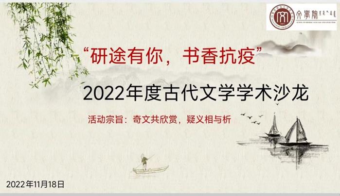 独学而无友,则孤陋而寡闻。勤学而交流,则博学而睿智。2022年11月18日上午,beat365中国古代文学学位点成功举办了主题为“研途有你,书香抗疫”的2022年度古代文学学术沙龙。古代文学硕士点的高林广、陆有富、石海光、付希亮、刘伟、张丽杰6位导师和高国庆、赵玉龙、马奥远等古代文学课教师以及学位点的全体研究生共40余名师生参加了本次学术沙龙活动。受新冠疫情影响,本次学术沙龙采取线上方式进行。