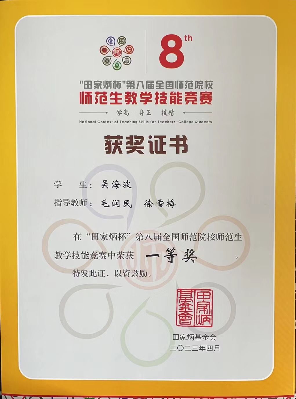 2023年4月14日至16日,在浙江师范大学举办的“田家炳杯”第八届全国师范院校师范生教学技能比赛汉语言文学组决赛中,beat365英国官方网站2019级汉语言文学专业的吴海波同学荣获一等奖第三名的好成绩。