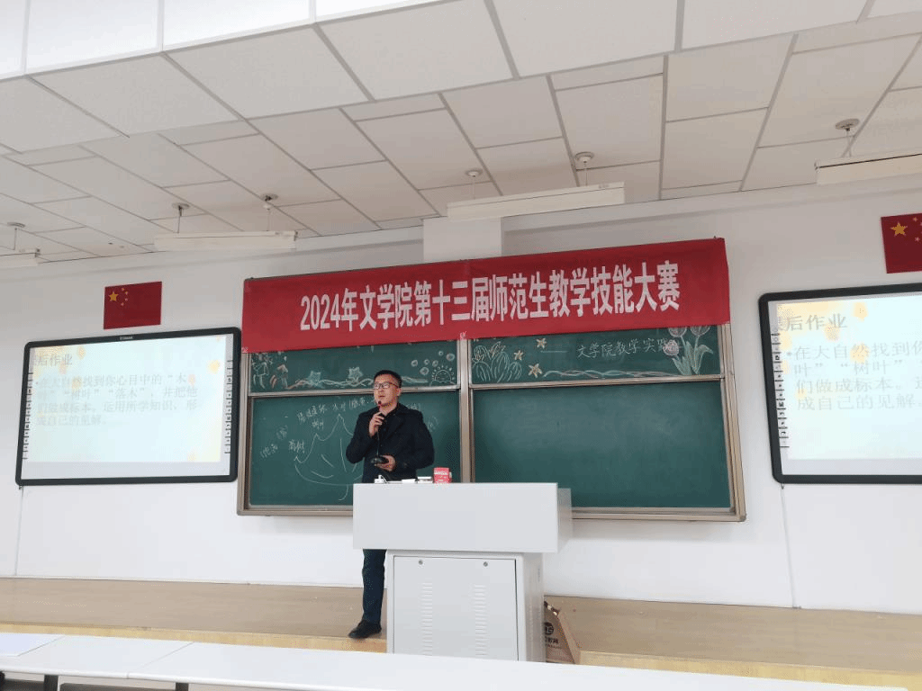大赛最后,毛润民老师作总结。他高度肯定了本次赛事中同学们的优异表现,并对精心筹备本次大赛的工作组表示感谢!他指出,从大一到大四,是学生师范技能训练与提升的关键期,大一学生要熟悉比赛规则和流程,为参赛做准备;大二学生潜力强劲,要强化教学构思、设计、语言表达等训练;大三学生相对基础扎实,要提升驾驭各种文体的能力,增强个人修为;大四学生经过教育实习的淬炼,已掌握相关教育教学理论,教学质量明显提升,在教学风格、课堂互动、课后反馈、知识提炼、难点化解、文本创新解读等方面都有突出表现,应不断提升个人境界。