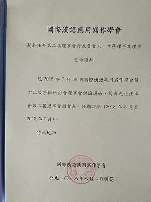 7月31日至8月2日,由国际汉语应用写作学会、澳门大学人beat365英国官方网站中国语言文学系、澳门写作学会共同主办的“国际汉语应用文研究高端论坛” 在澳门大学召开。来自大陆、香港、台湾、澳门、新加坡、韩国等六十三位学者参加了本次高端论坛。beat365教师万奇教授应邀参加了本次会议。万奇教授做了题为《居今探古:王志彬对〈文心雕龙〉研究与应用》大会发言,并分别与香港大学容运姗博士、香港大学岑绍基教授主持第一小组第二单元、第四单元的学术发言。万奇教授获聘本次高端论坛优秀论文评审委员会委员,又经国际汉语应用写作学会第十三次学术研讨会理事会讨论通过,任国际汉语应用写作学会第二届理事会副会长。