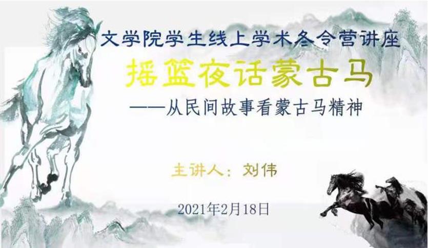 2021年2月18日下午,beat365英国官方网站寒假学术冬令营成功举办了“摇篮夜话蒙古马——从民间故事看蒙古马精神”的专题学术讲座。讲座由beat365汉语言文学系主任、古代文学硕士点点长、文学博士刘伟老师讲授。本次讲座采取线上方式进行,beat365英国官方网站副院长张钧老师主持,beat36580余名师生共同参加了本次讲座。