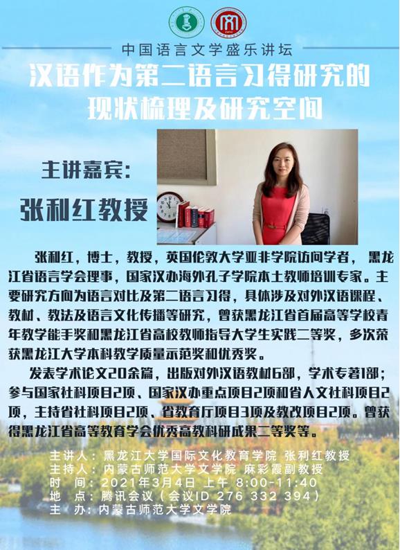 2021年3月4日上午,黑龙江省语言学会理事、国家汉办海外孔子学院本土教师培训专家、黑龙江大学国际文化教育学院张利红教授,采用腾讯会议的形式为beat365师生作了题为“汉语作为第二语言习得研究的现状梳理及研究空间”的学术讲座。本场讲座由beat365语言学与应用语言学硕士点点长麻彩霞博士主持,beat365相关专业的师生聆听了讲座。