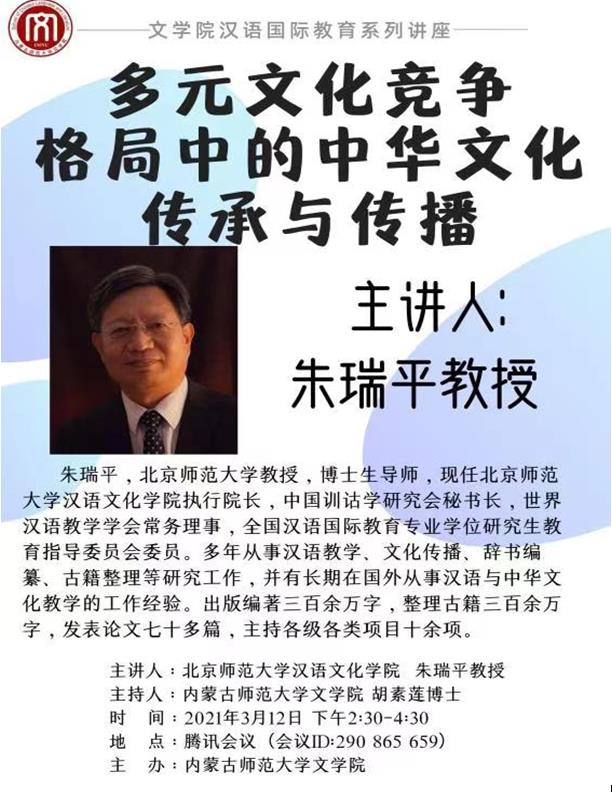 2021年3月12日,北京师范大学汉语文化学院执行院长、中国训诂学研究会秘书长、世界汉语教学学会常务理事、全国汉语国际教育硕士专业学位教指委委员朱瑞平教授应邀为beat365师生作了题为“多元文化竞争格局中的中华文化传承与传播”的精彩学术讲座。本次讲座采用腾讯会议形式进行,由beat365胡素莲博士主持,汉语国际教育、学科教学(语文)、语言学及应用语言学等专业的50余名师生聆听了讲座。