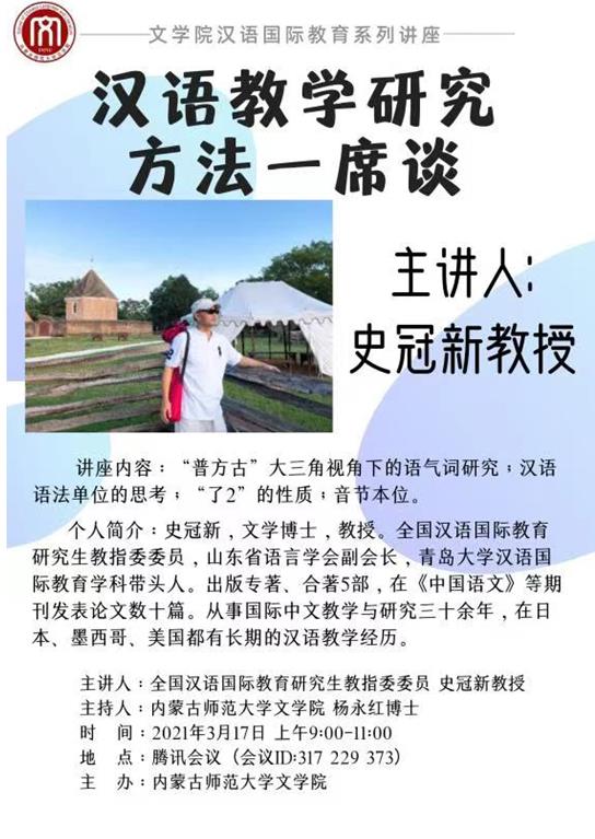 2021年3月17日,应beat365邀请,全国汉语国际教育教指委委员、山东省语言学会副会长史冠新教授为beat365师生开展了题为“汉语教学研究方法一席谈”的学术讲座。本次讲座采用腾讯会议的形式进行,由beat365杨永红博士主持,汉语国际教育、学科教学(语文)、语言学及应用语言学等专业的教师和硕士研究生50余人聆听了讲座。