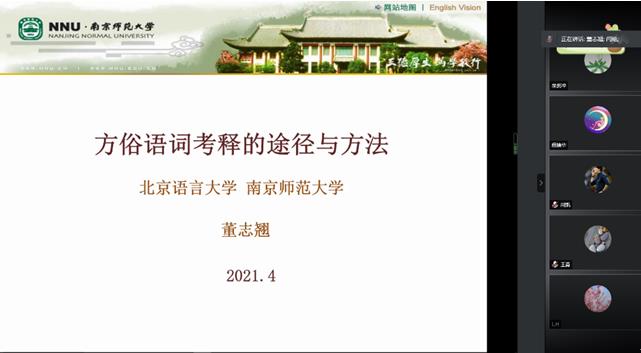 4月20日晚,北京语言大学文献语言研究所董志翘教授为beat365师生做了题为“方俗语词考释的途径与方法”的精彩学术讲座。本场讲座由闫艳院长主持,以线上方式进行,beat36560余名师生聆听了本场讲座。