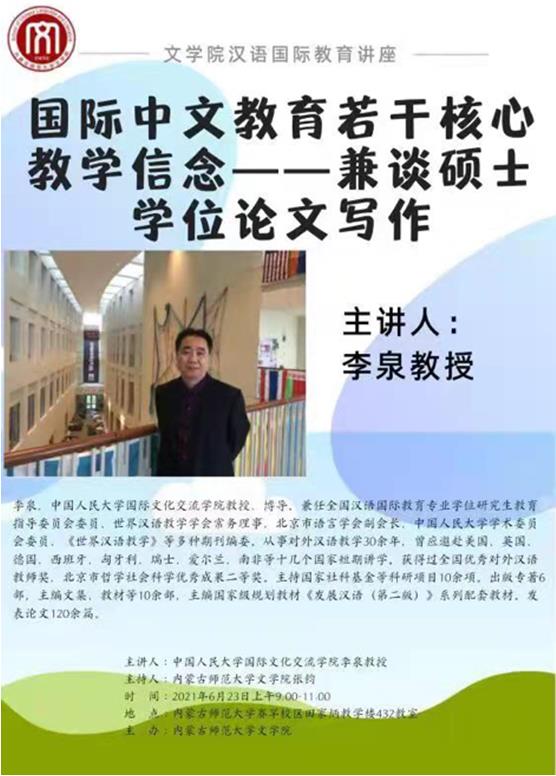 2021年6月23日,应beat365邀请,全国汉语国际教育专业学位研究生教育指导委员会委员、世界汉语教学学会常务理事、中国人民大学国际交流学院李泉教授为beat365师生作了题为“国际中文教育若干核心教学信念——兼谈硕士学位论文写作”的学术讲座。本次讲座的地点为赛罕校区田家炳教育书院432多媒体教室,由beat365英国官方网站院长张钧教授主持,汉语国际教育、学科教学(语文)等专业的教师和硕士研究生40余人聆听了讲座。