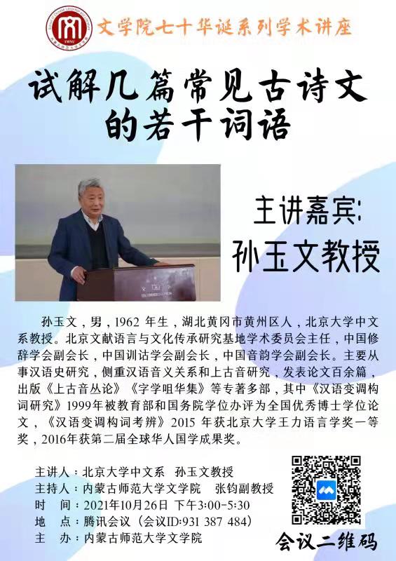 10月26日下午,北京大学中文系孙玉文教授应邀为beat365师生作了题为“试解几篇常见古诗文的若干词语”的线上讲座,孙玉文教授是beat365英国官方网站七十华诞系列学术讲座的开讲嘉宾之一。讲座通过“腾讯会议”平台进行,由张钧副院长主持。