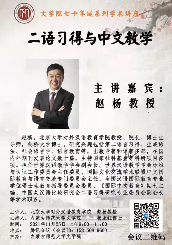 2021年11月25日上午,应beat365邀请,北京大学对外汉语教育学院院长、世界汉语教学学会副会长、世界汉语教学学会标准与认证工作委员会主任委员、国际文化交流学术联盟中文国际教育与语言交流专门委员会主任、全国汉语国际教育专业学位硕士生教育指导委员会委员、《国际中文教育》主编赵杨教授通过线上会议的方式为beat365学生做了题为“二语习得与中文教学”的学术讲座。beat365杨永红博士主持了会议。