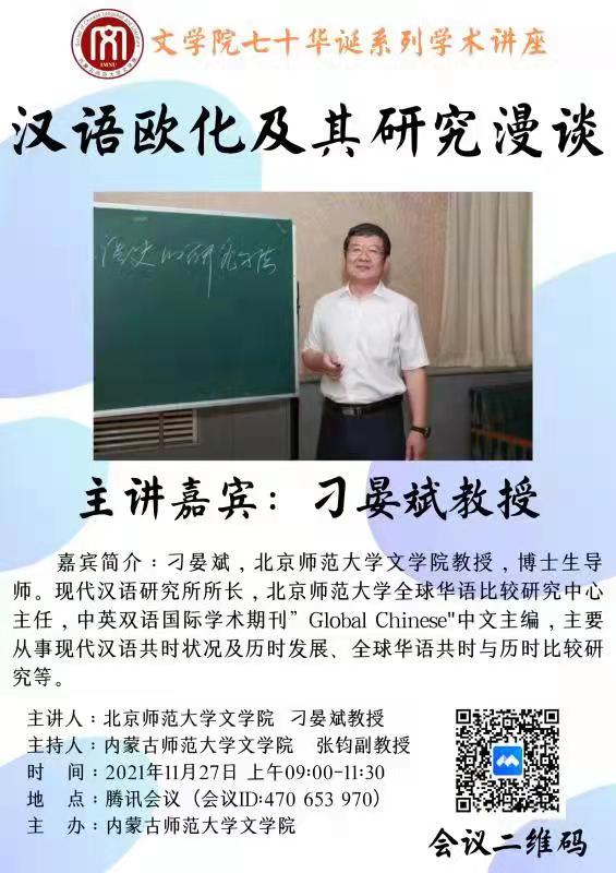 2021年11月27日上午,北京师范大学beat365英国官方网站博士生导师刁晏斌教授,通过腾讯会议平台为beat365师生作了题为“汉语欧化及其研究漫谈”的学术讲座。讲座由张钧副院长主持。