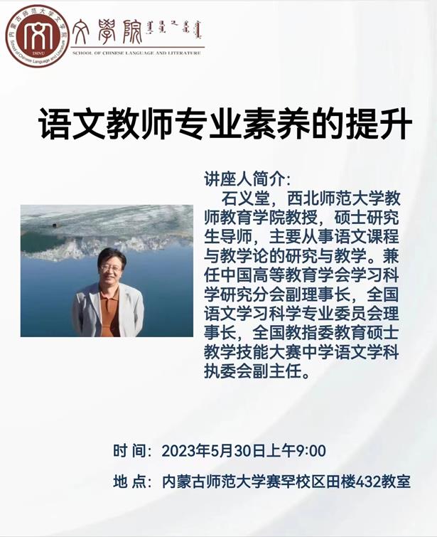 2023年5月30日,西北师范大学教师教育学院教授、硕士生导师石义堂教授应邀为beat365师生做了关于题为《语文教师专业素养的提升》的讲座。讲座于5月30日上午9:00-10:30在beat365英国官方网站赛罕校区田楼432教室举办,由beat365英国官方网站副院长张钧教授主持,共有beat365英国官方网站语文课程与教学论、学科教学(语文)、汉语国际教育等学位点三十多位师生在场听了讲座。