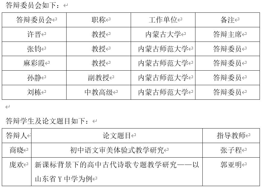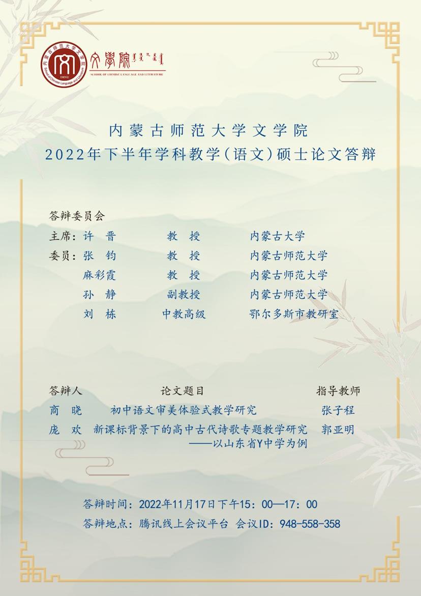 学科教学(语文)专业2022年下半年硕士学位论文答辩定于2022年11月17日下午(15:00——17:00)召开。根据《关于做好2022年下半年博士、硕士研究生学位授予工作的通知》的要求,本次答辩采用的方式为网络视频答辩,使用的远程会议软件为腾讯会议,会议号为948-558-358。本次答辩会特别邀请了内蒙古大学教授、博士研究生导师许晋担任答辩主席。欢迎广大师生参加交流。