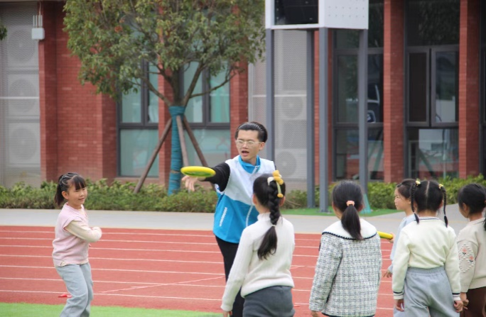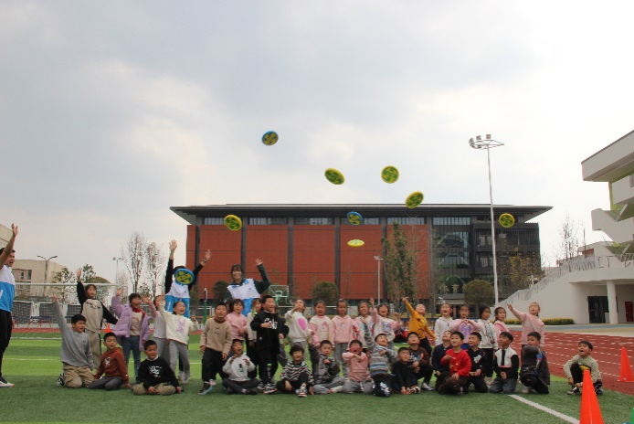 活动中,志愿者们带领小朋友们用拖拉机舞热身,一起配合进行“桃花朵朵开”游戏,在锻炼小朋友们身体协调能力的同时,增强团队意识。虽然七中小学生们此前并未接触过飞盘运动,但在志愿者们有序组织下,小朋友们热情参与飞盘活动,他们在活动中逐渐熟悉这一休闲运动,还通过团队联系增强了了互相帮助、团结协作的意识。希望通过这次活动,增强他们的体魄,培养他们对于体育的热爱,让他们在成长的道路上走得更加坚定和自信。