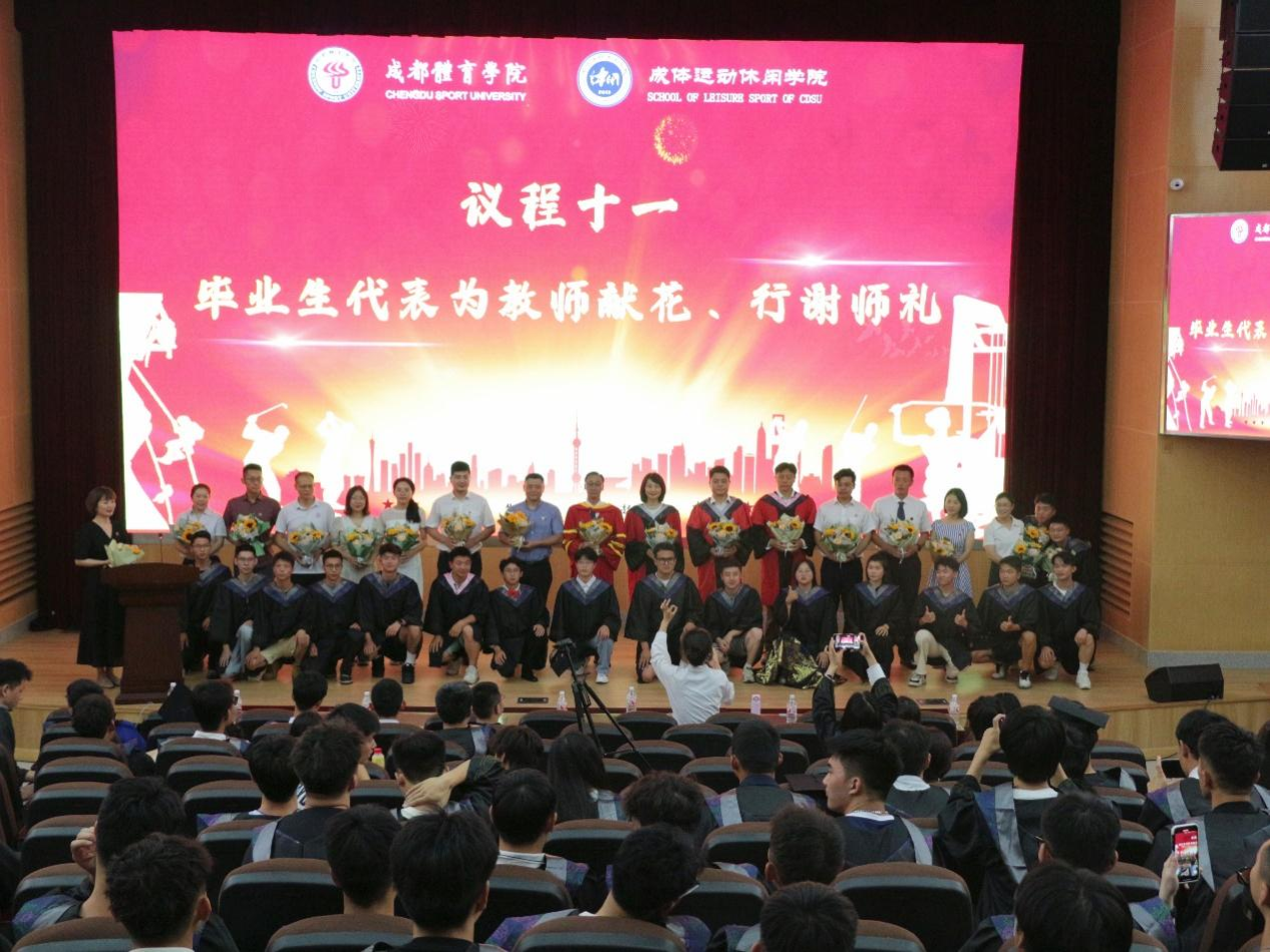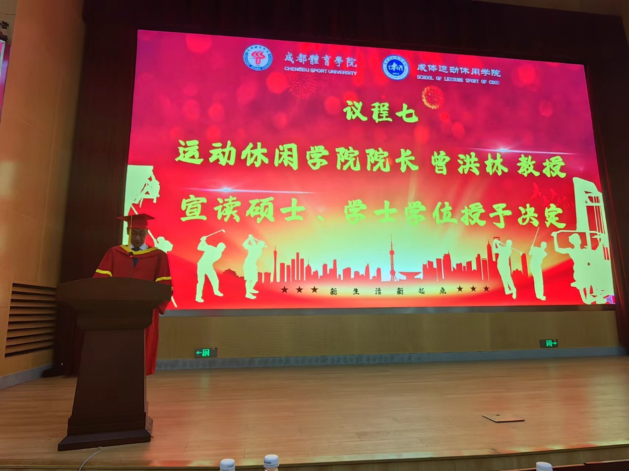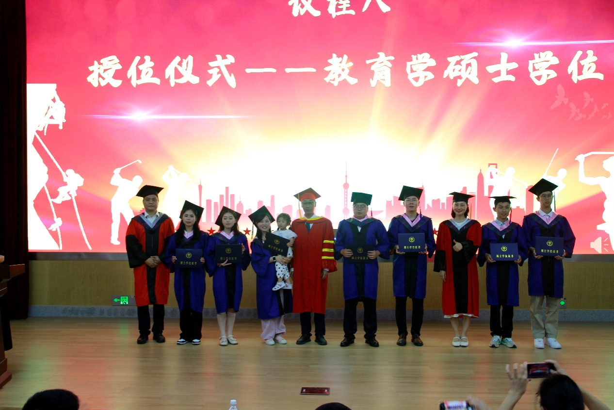 随后,运动休闲院院长曾洪林教授宣读硕士、学士学位授予决定,曾洪林教授、闫虹副教授、蒋书君副教授为获得硕士学位同学授位。曾洪林教授、舒建平教授、闫虹副教授、蒋书君副教授、徐鹏老师上台为获得教育学学士学位同学授位。