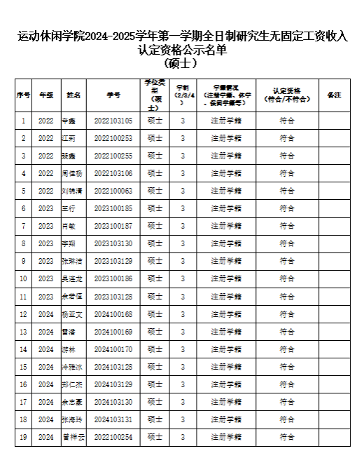 PP电子游戏网站2024-2025学年第一学期全日制研究生无固定工资收入认定资格公示名单 (硕士)